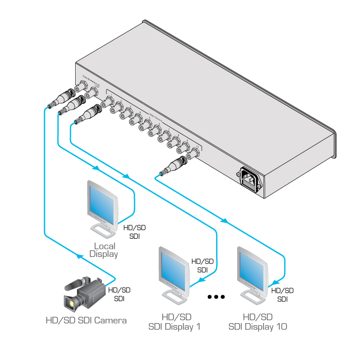 | OUTPUTS: | 10 equalized and reclocked SMPTE−259M/292M/424M outputs, 75Ω on BNC connectors; 1 looped GENLOCK 75Ω/Hi−Z on a BNC connector. |
