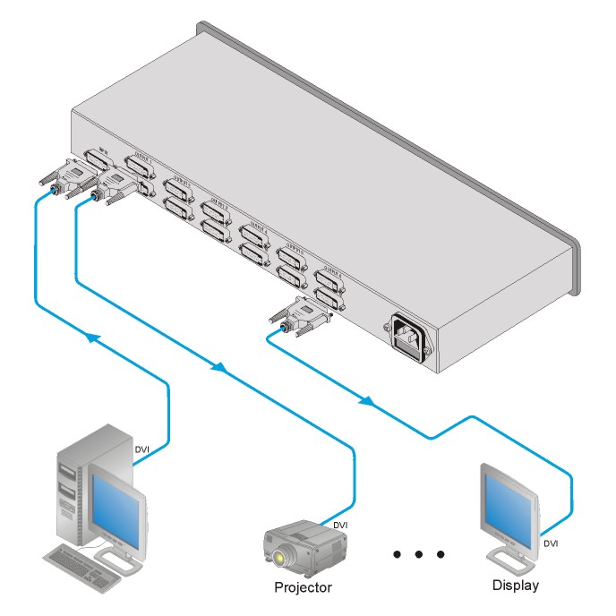 | OUTPUTS: | 12 DVI−D on DVI−I connectors, 1.2Vpp; DDC signal 5Vpp (TTL). |