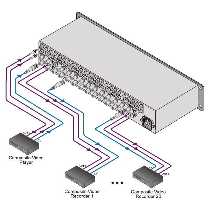 | OUTPUTS: | 20 video (1:20, 2x1:10, 4x1:5, 1:10, 2x1:5), 1Vpp/75Ω on BNC connectors; 20 unbalanced stereo or balanced mono audio (1:20, 2x1:10, 4x1:5, 1:10, 2x1:5), +4dBu/50Ω 27Vpp max. on RCA connectors. |