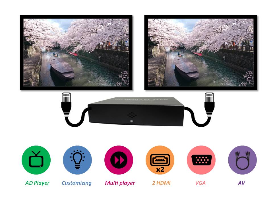 1080P Video output HDMI*2 /VGA*1/AV*1 output for displaying contents in monitor(s) Supports photo rotate, zoom and slide show |