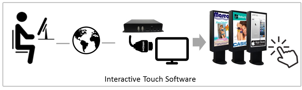 Touch content can be distributed to terminal player (PCB) by internet or USB disk.