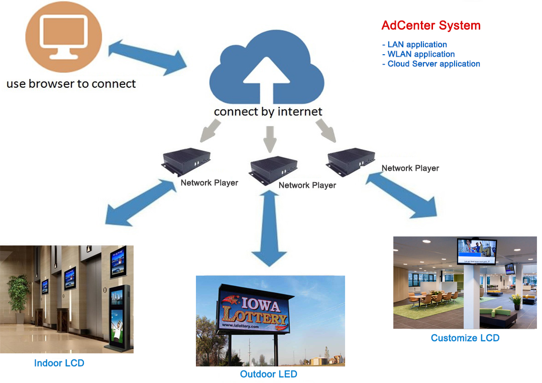 1) Contents are obtained via network and stored in local disk for playback on a loop, at a specified time or idle hours, or as instant break-ins.